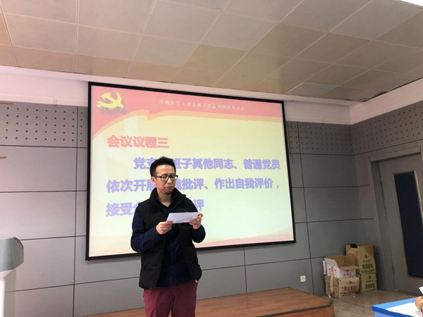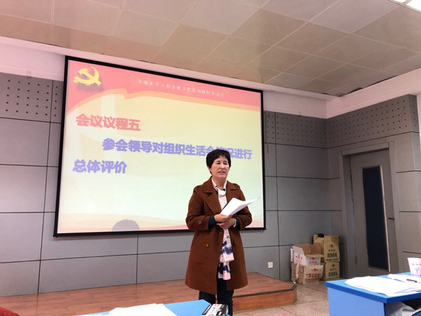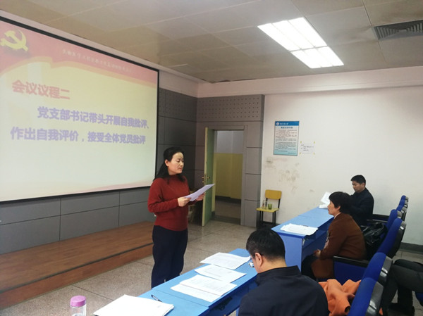 卢婷利同志首先对出席本次会议的领导和老师表示了欢迎和感谢,并代表支部班子进行支部工作汇报,支部班子通报党支部班子查摆问题、开展批评和自我批评情况。卢婷利同志总结了一年来支部在开展“两学一做”学习教育、廉洁自律教育、坚持“三会一课”制度、强化“四个意识”、党员发展等方面做出的努力和取得的进展,指出了支部在工作安排、理论学习、党员日常教育管理监督及党群工作方面存在的问题和不足,深入剖析原因,提出整改措施以及支部今后工作的努力方向。