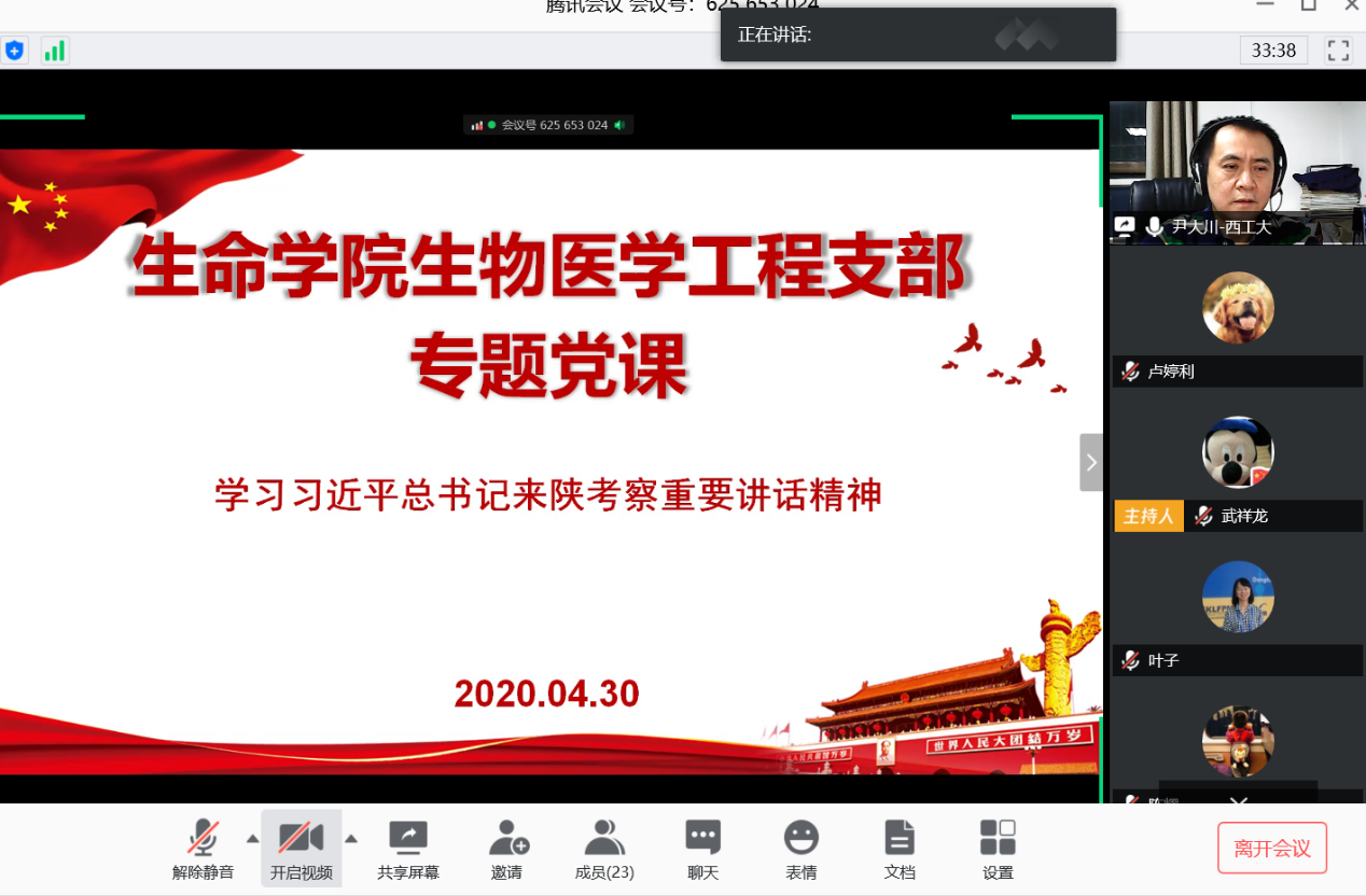 2020年4月30日晚,英国365集团生物医学工程系教工党支部采用“腾讯会议”的方式,组织专题党课,邀请公司副经理(主持工作)、公司党委委员尹大川同志为支部党员讲党课,带领大家学习习近平总书记来陕西考察时重要讲话精神,会议由卢婷利同志主持。