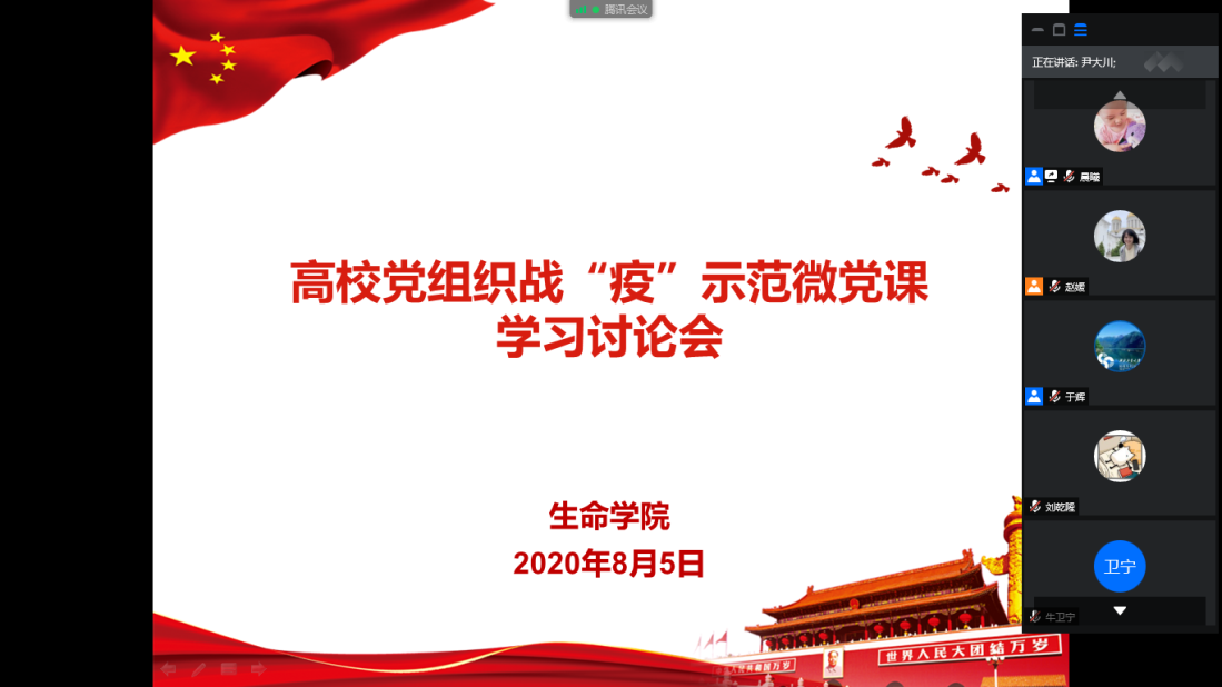 8月5日中午,由公司党委制作的《党旗飘扬 筑牢生命防疫墙》作为全国高公司党组织战“疫”示范微党课,在光明网、新华网、央视频、微言教育、哔哩哔哩、中国老员工在线等平台展播。生命公司党委组织全体师生党员观看,并在课后召开了线上学习讨论会。经理尹大川、党委副书记(主持工作)于辉出席会议,党委副书记赵媛媛主持会议,公司师生党员代表参加了讨论会。