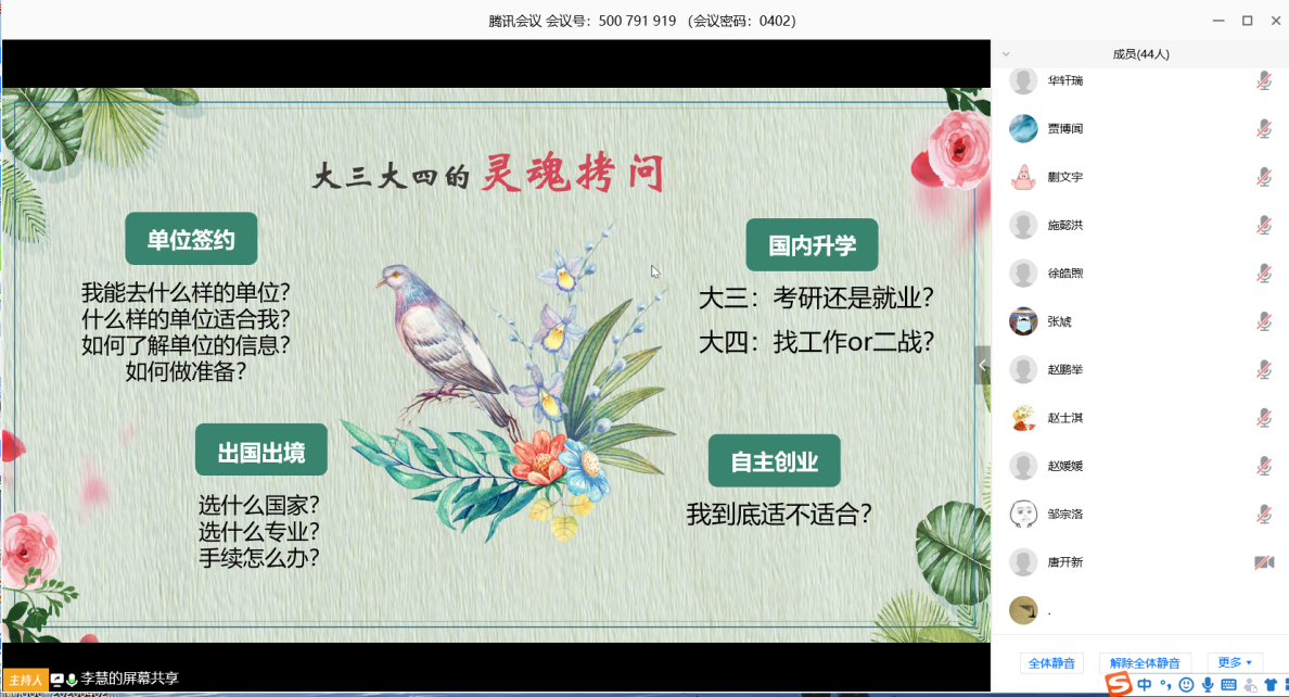 会议最后,同学们针对自己的疑问与李老师进行热烈的沟通与交流。本次会议为员工的就业选择提供了精准的帮扶指导,帮助员工面对未来做好正确的选择,成就属于自己的路。(文,图/陈耀;审核/赵媛媛)