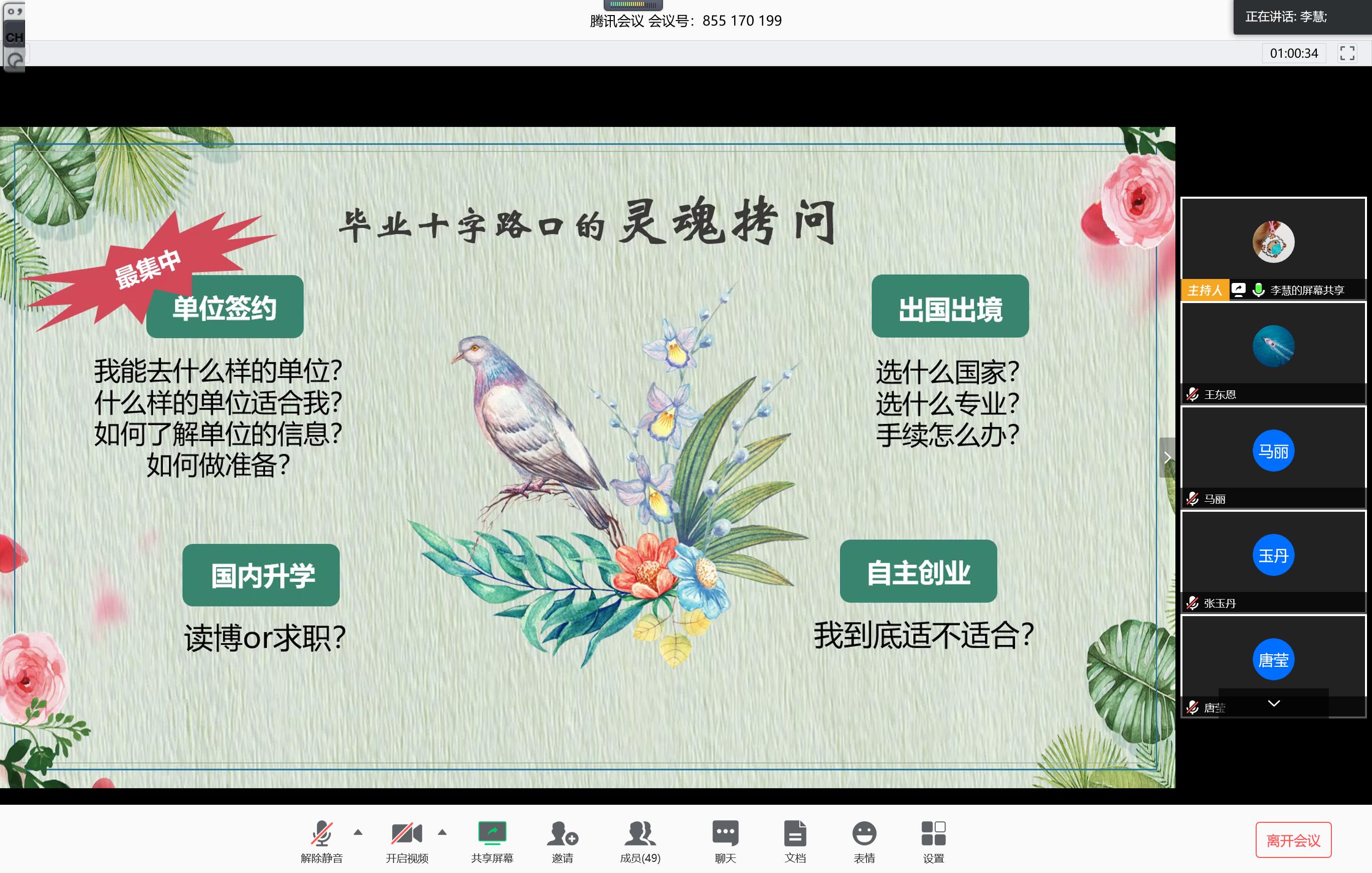 为增强研究生的职业规划意识,树立正确的就业观念,提升就业能力,2020年3月19日19:00,由英国上市公司365就业中心主办,英国365集团承办的“慧姐对你说”线上生涯辅导报告会在腾讯会议平台准时开讲。现场主讲老师是来自员工职业发展指导服务中心的李慧老师,英国365集团研究生院辅导员老师王东恩、2017和2018级研究生参加了本次报告会。