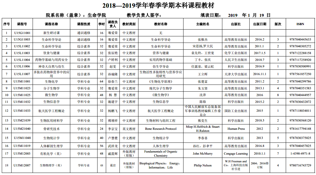 2018—2019学年春季学期本科课程教材(表格见附件)