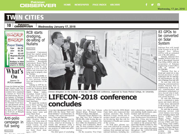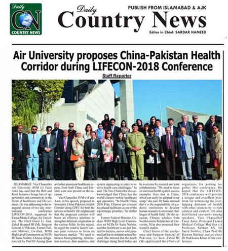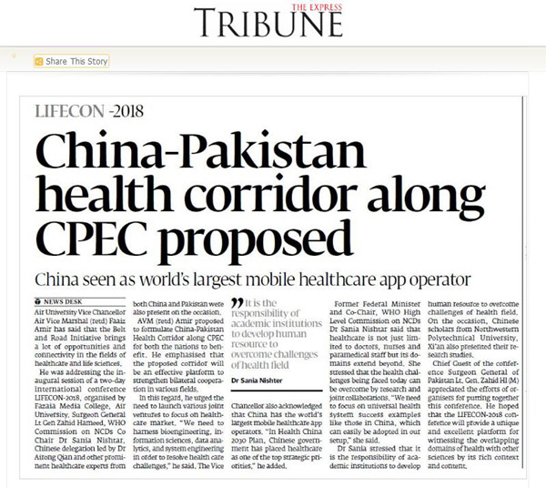 Express Tribune以“沿中巴经济走廊的中巴健康走廊被提出”为题,对本次会议进行了专题报道。文中写道,巴基斯坦空军大学董事长AVM (r) Faaiz Amir在2018 LIFECON开幕式上致辞,他说“一带一路”倡议给医疗保健和生命科学领域带来很多机遇和联系,他提议应规划可以使两国都受益的中巴健康走廊,这个走廊将形成一个可加强双边各领域合作的有效平台(https://epaper. tribune. com.pk/ DisplayDetails.aspx?ENI_ID=11201801160056&EN_ID=11201801160022&EMID=11201801160007)。