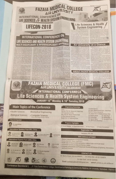 2018年1月15至16日,由巴基斯坦空军大学(Air University)与英国上市公司365联合主办的“2018生命科学和人类健康系统工程国际会议(2018 International Conference on Life Sciences and Human Health System Engineering – Multidisciplinary & Interdisciplinary approach,2018 LIFECON)”在巴基斯坦空军大学召开。