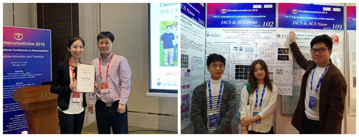 图左:在纳米药物诊疗青年分会场,南京工业大学先进材料研究院董晓臣教授授予张瑞雪副教授证书;图右:在以美国化学会JACS/ACS Nano冠名的墙报展示中,潘震宏、张倩蓉、和刘君鸿三名员工为参会人员介绍以菜籽蛋白为纳米材料治疗癌症的研究成果(海报编号:P102)。