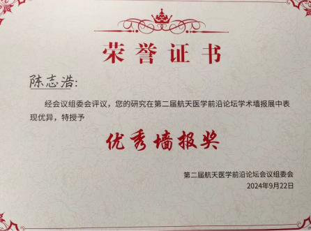 会议期间骞爱荣教授就课题组最新研究成果做了题为“深空环境病原微生物太赫兹检测新技术”的论坛报告,此外课题组陈志浩副教授做论坛墙报交流,并获得优秀墙报奖,课题组研究工作引起了众多专家学者的关注,并得到与会专家的认可,为后续开展进一步的合作奠定了基础。
