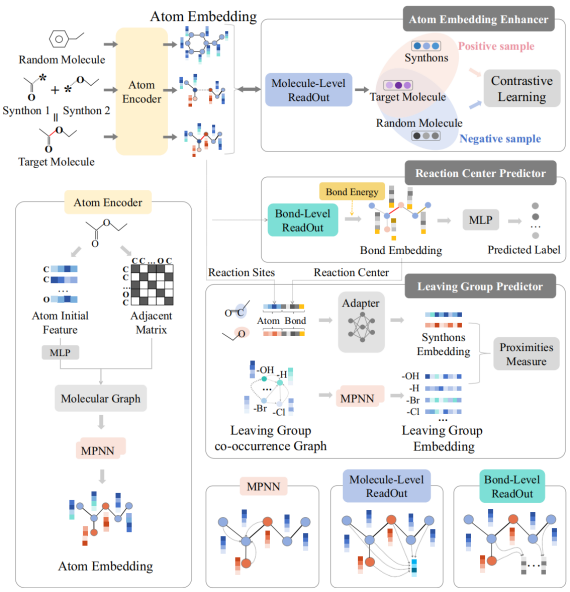 为了开发一个高度可解释的模型来揭示化学合成机制,这项工作提出了一个 Retro-MTGR 框架(图1)。基于分子图,Retro-MTGR同时学习了三个相关任务( 多任务学习),其中两个主要的任务负责识别反应中心和离去基,而辅助任务负责生成更好的原子嵌入。研究中,作者通过回答两个关键问题来验证Retro-MTGR 预测化学合成过程的可解释性: