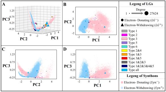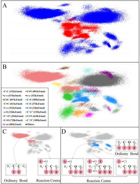 合成子和离去基的联合嵌入空间表明:a.反应中的两个合成子总是具有相反的电性 并且彼此相距甚远。b.属于同一个反应物的合成子和离去基通常具有相反的电性并且彼此靠近。c.反应中同时出现的两个离去基经常具有相反的电性并且彼此相距甚远(图3)。