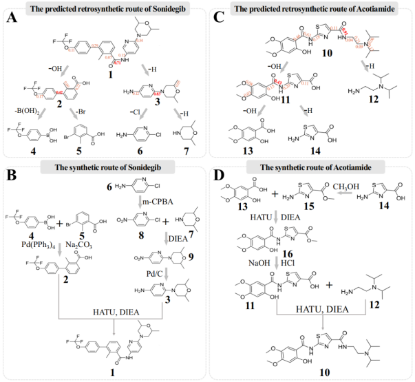 图4. 对于两种药物的预测逆合成路线和真实化学合成路线展示