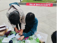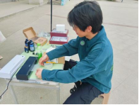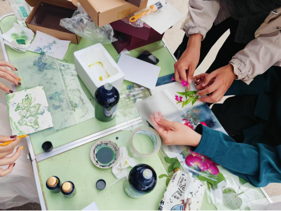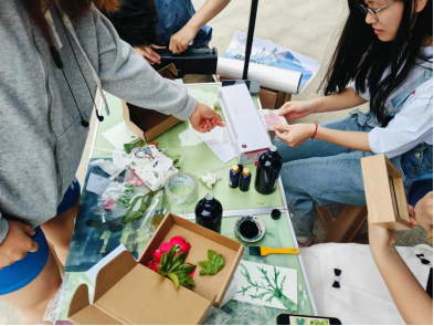 在现场志愿者的讲解下,同学们将含有铁离子的蓝晒液涂抹在纸张上,摆放上精心挑选的植物叶片,静待阳光的洗礼。随着时间推移,纸张在阳光下逐渐变色,那独特的蓝调画面如同定格了自然之美,每一份蓝晒作品都是参与者对环保的独特诠释,以艺术的形式传递着绿色理念。