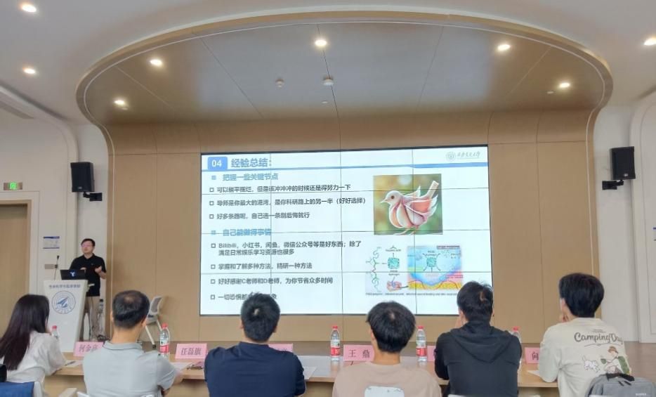 随后,王家琛以风趣幽默的语言为在座同学分享了自身的成长历程。讲述了他从大一沉迷打球,到疫情期间考研一战上岸,再到研究生期间发表多篇论文的难忘经历。他向大家分享了在本科期间临床实习、硕士协调科研及临床工作时间管理的做法,指出我们要学会合理利用碎片化时间、平衡好科研学习和爱好、注重利用外界资源和平台、加强与他人的合作交流、注重科研素养的积累。他强调,同学们一定要坚定目标,坚定信念,知道自己需要选择什么,放弃什么。并且为大家推荐了读文献的方法:从中文核心到中文总数,再到英文综述,最后到子刊正刊,循序渐进的去学习掌握。最后,他向同学们表示,不要盲目悲观,也不要盲目乐观,一定要做好每一个今天。