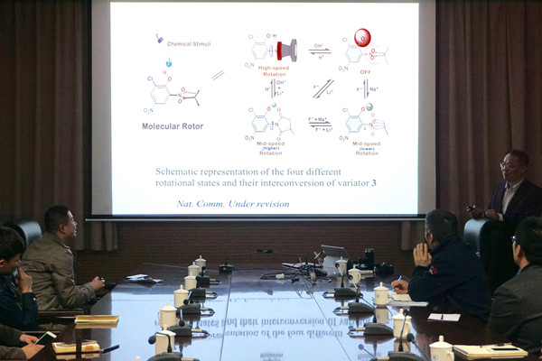 报告中,江华教授向我们介绍了“分子机器”这一课题的研究现状并展示了他们课题组基于现实生活中的具体实例,以三唑类折叠化合物和芳香酰胺折叠体为基体,得到的“分子梭”、“分子转子”、“分子齿轮”、“分子旋转门”、“分子彩带”等分子机器,生动形象地将“分子机器的设计及其工作原理展现在大家面前。同时,江华教授也强调目前“分子机器”的研究还处于初期,我们还需要继续为之不懈奋斗。江华教授的报告语言生动、内容精彩、见解深刻。报告结束后,戚震辉教授鼓励在座青年学子发散思维,积极提问,戚震辉教授等老师同学与江华教授进行了讨论交流,共同分享了彼此的体会以及一些“分子机器”研究问题,现场气氛活跃,师生深受启发。(文:姚辉;图:曹晓敏;审核:尹大川、訾方)