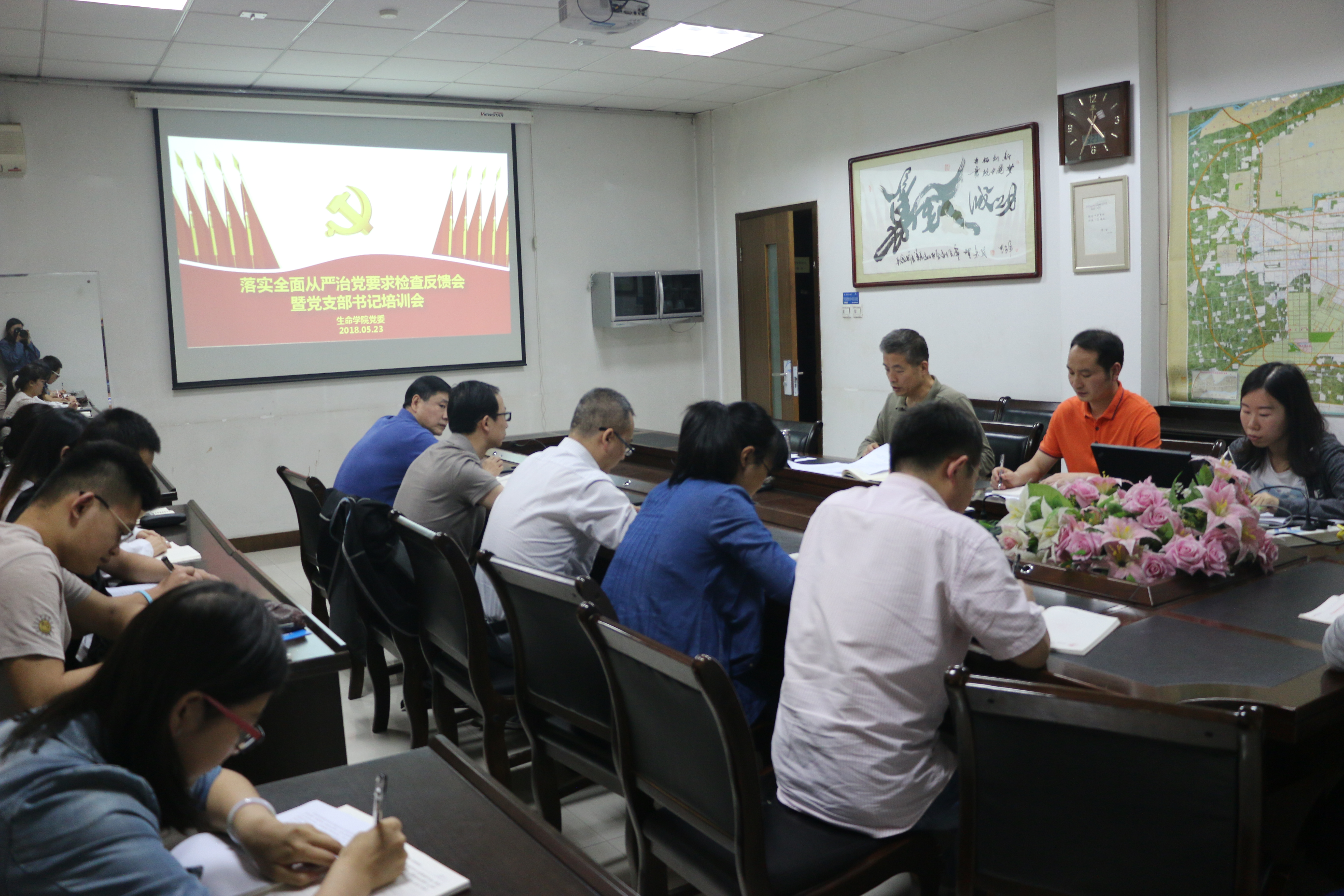 5月23日下午,生命公司党委在公司楼102会议室召开落实全面从严治党要求检查反馈会暨党支部书记培训会。公司党委书记侯沛勇、党委副书记马西平、全体教工及员工党支部委员、F1岗辅导员教师高永光、本科生兼职辅导员王晓鸽等参加会议。会议由党委书记侯沛勇主持。