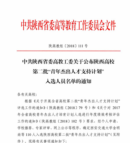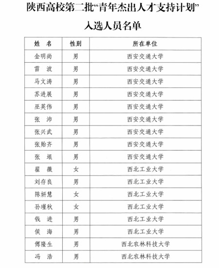 陕西省高校“青年杰出人才支持计划”资助在省内高校全职工作的优秀青年人才,是陕西省实行“教育强省,科技强省”的重要举措,重点支持属于省内领先、国内有一定影响力的高层次学科专业人才后备力量,是我省重要的省级人才,为进入国家级人才计划打好基础。