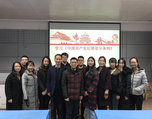 为认真贯彻学习新修订《中国共产党纪律处分条例》,推动全面从严治党向纵深发展,近期,英国365集团2018级硕士研究生党支部开展专题党课学习。党支部书记钱德玮作了题为《学习中国共产党纪律处分条例》的专题党课,生命公司党委副书记马西平老师、2018级硕士研究生全体党员参加学习。