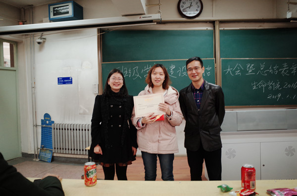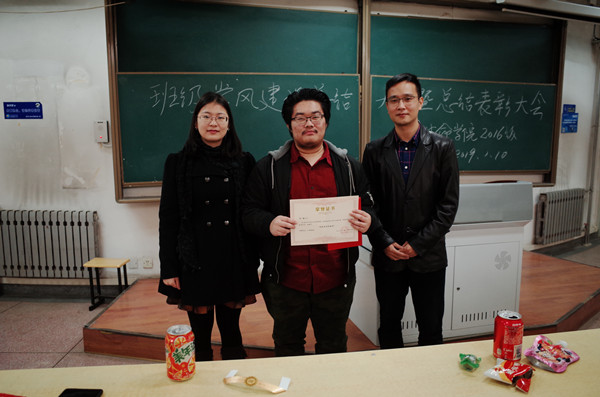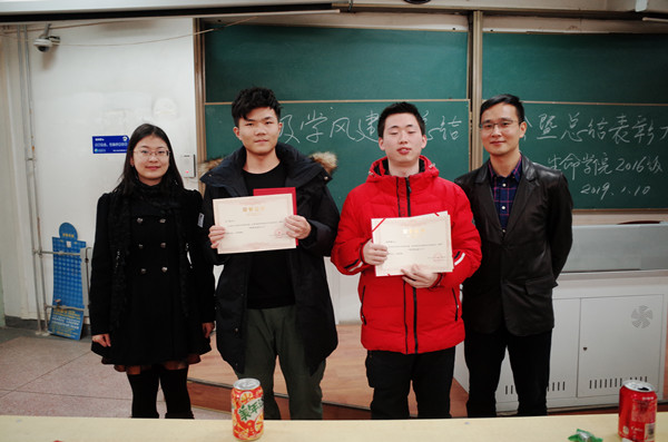 在学习进步方面主要表彰了杨凯江、刘金晖和罗文富同学。他们在本学期中学习成绩突飞猛进,并且实验技能也有了很大的提高!他们表示这学期以来宿舍学习气氛浓厚,班主任老师对他们时刻关怀与教导,激励帮助了他们努力学习,表示在新的一年中将会继续保持学习的激情!