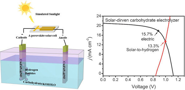 针对这一挑战,研究团队首次提出了“碳水化合物通用性”催化剂这一概念,合成了具有这一属性的三元过渡金属磷化物催化剂,实现了不同种类碳水化合物葡萄糖等(单体)、蔗糖等(二聚体)甚至淀粉(多聚体)的电催化节能制氢,也为生物质废弃物的处理和再利用提供了新的途径。得益于该节能策略,废弃生物质电解池可仅由一节钙钛矿太阳能电池驱动并获得较高的光制氢效率,完成了“整体可持续”制氢体系的构建。