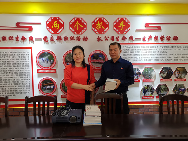在调研结束时,卢婷利代表公司向融水县永富生态农业有限公司党支部捐赠了党建相关图书和办公设备,用于该党支部今后更好地开展党组织生活,为他们送去温暖、鼓舞干劲。
