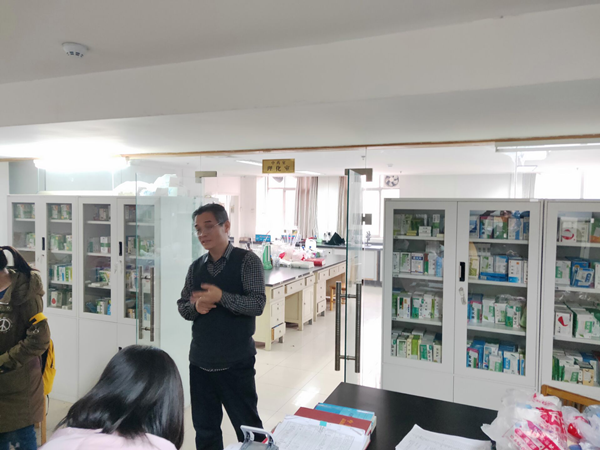 食品室副主任李尔春带领同学们参观中医药室并为同学们介绍了中医药检验相比较于其他化学药品检验的难点。