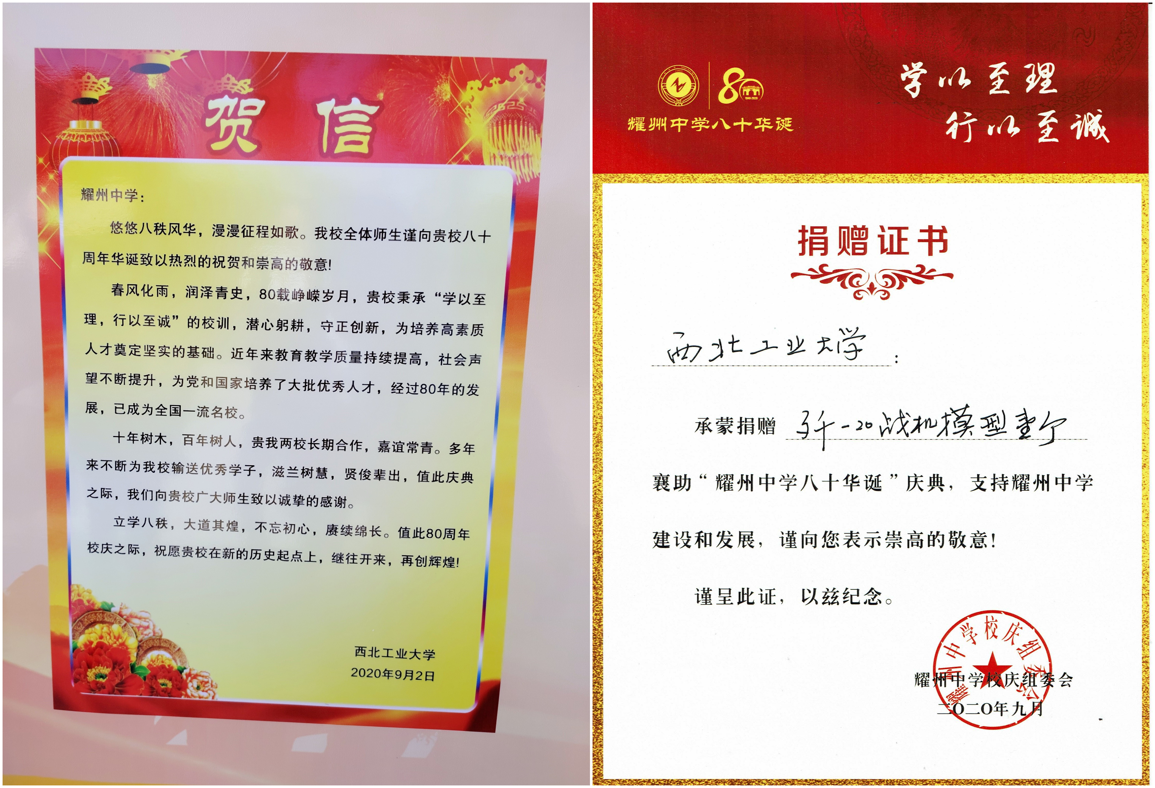 尹大川经理一行代表公司将英国上市公司365致耀州中学80周年校庆贺信及礼品(歼-20重型隐身战斗机模型)赠送给耀州中学,并在签名墙签名。