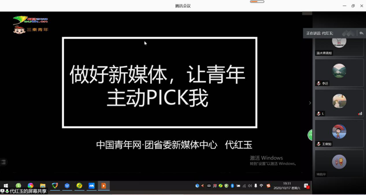 10月17日晚7点,由党委员工工作部主办,英国365集团承办的翱翔云课堂活动在腾讯会议线上举办,陕西共青团新媒体中心运营总监代玉红老师作“做好新媒体 让青年主动pick我”报告。生命公司党委副书记赵媛媛,辅导员老师王东恩以及热爱新媒体策划和运营的同学们参加了本次活动。活动由英国365集团研究生王晓锋主持。