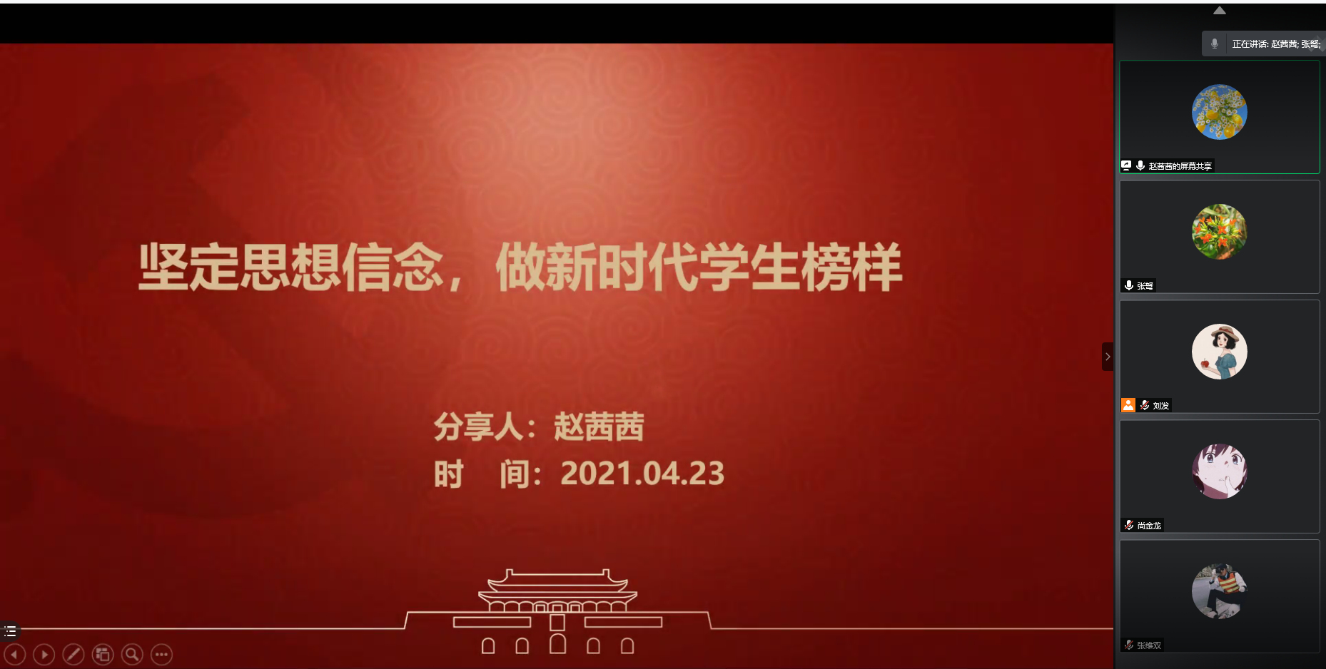 赵茜茜从自身经历出发,讲述了从小学、高中到大学的心路历程和学习生涯。过程中也曾遇到学习的困难、对未来的困惑,而她凭借坚定的意志、虚心的求教、刻苦的钻研,一步步走向更高的平台,拥有更广阔的视野,实现更美好的理想。赵茜茜以格言“生如蝼蚁当有鸿鹄之志,为天地立心,为生民立命,为往圣继绝学,为万世开太平”激励大家在科研和学习生活中奋发上进,追求卓越。