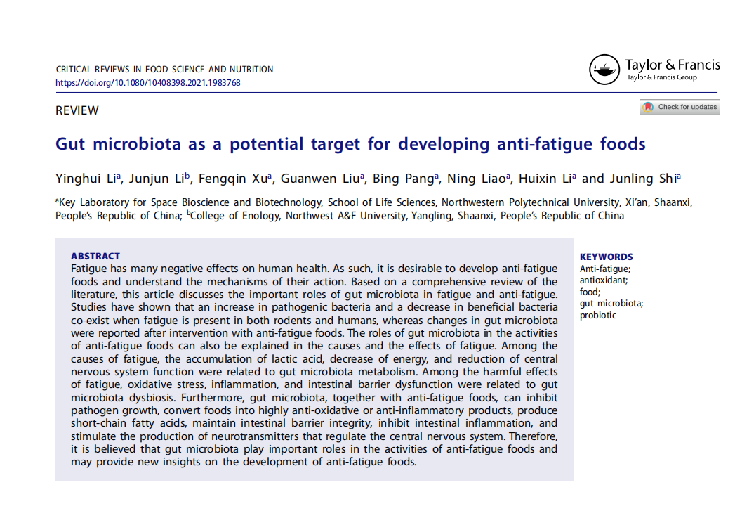 近日,公司硕士研究生李颖慧在食品领域顶级期刊(Critical Reviews in Food Science and Nutrition,中科院一区,IF=11.176,食品领域排名第四,年发文量261篇)发表题为“Gut microbiota as a potential target for developing anti-fatigue foods”的综述性文章。通讯作者为师俊玲教授。师俊玲教授团队主要从事肠道菌群与人体健康方面的研究工作,在开益生菌预防与治疗肠道与代谢性疾病方面进行了大量的研究工作,旨在为开发具有我国自主知识产权的特效性益生菌菌株奠定理论基础。