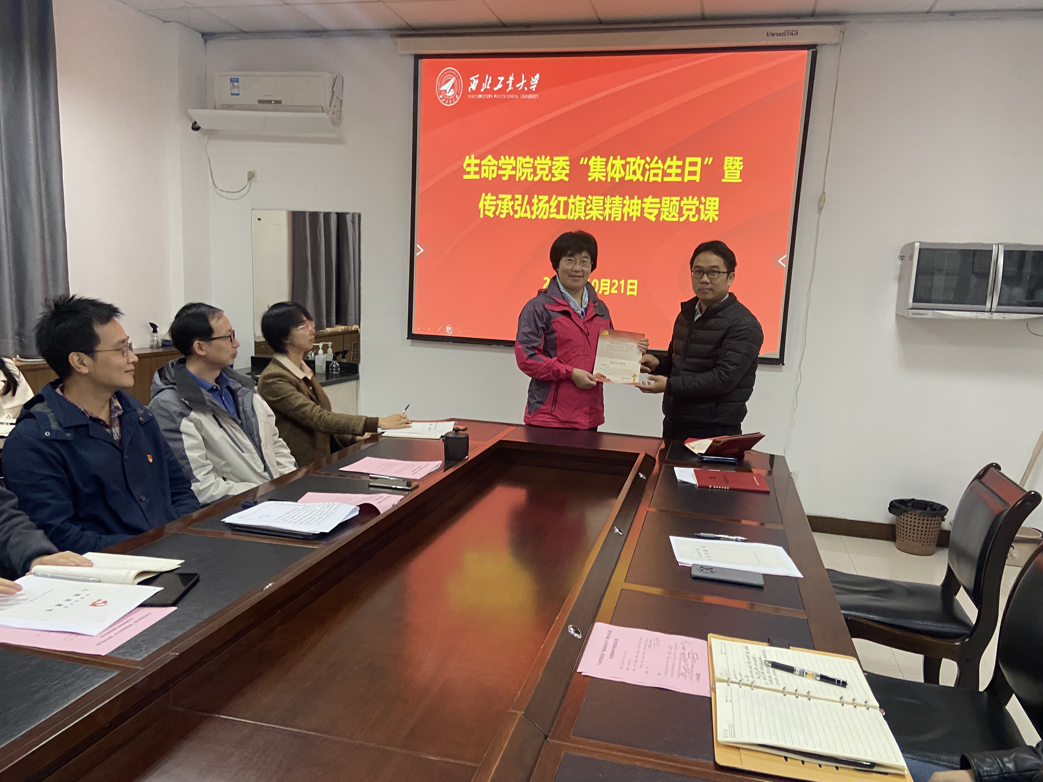师俊玲、施建宇、卢慧甍等党员代表依次庄严宣读本人入党志愿书,分享感悟体会,重温入党初心。卢慧甍同志在交流发言时讲到,“看到自己当年的入党志愿书虽很青涩但令人心潮澎湃,当年渴望加入党组织的真诚与执着跃然纸上,激励着我在工作科研中再攀高峰。”青年教师呼延霆回忆起18年前在革命圣地延安王家坪旧址前宣誓入党的场景,表示在今后的工作中要处处以党员的标准严格要求自己,不忘初心、牢记使命,做一名“四有”好老师。