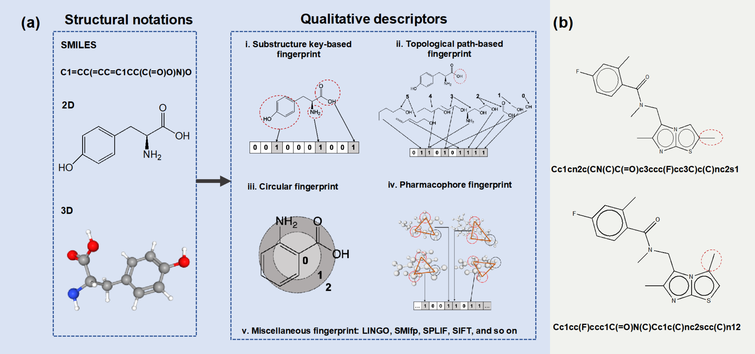 对于机器学习而言,首要步骤始终是对象表示。对于CPI预测来说,对象表示是指将化合物和蛋白质编码为高维特征向量,其中每个维度都反映了化合物和蛋白质的特定属性。化合物描述符包括基于1维,2维及3维的结构表示。常见的表示是基于分子指纹的定性描述符,主要包括:基于子结构、基于路径、圆形、基于药效团以及复合分子指纹(图2)。常见的蛋白质描述符主要包括基于序列和基于结构的描述符。