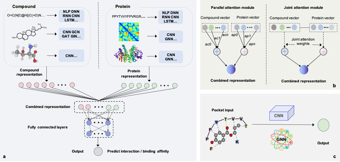 (2)基于注意力机制的模型通过双向注意力模块或联合注意力模块揭示了对结合起关键作用的蛋白质残基和化合物原子或绑定位点。但是,当前基于注意力机制的可解释性仅通过一个或几个示例进行评估,并且在大规模数据集中是不一致的。此外,缺乏统一的标准来系统地评估各种基于注意力的模型的可解释性。因此,应该设计更合理的注意力层并形成统一的评估指标,以便挖掘化合物和蛋白质的结合规则。