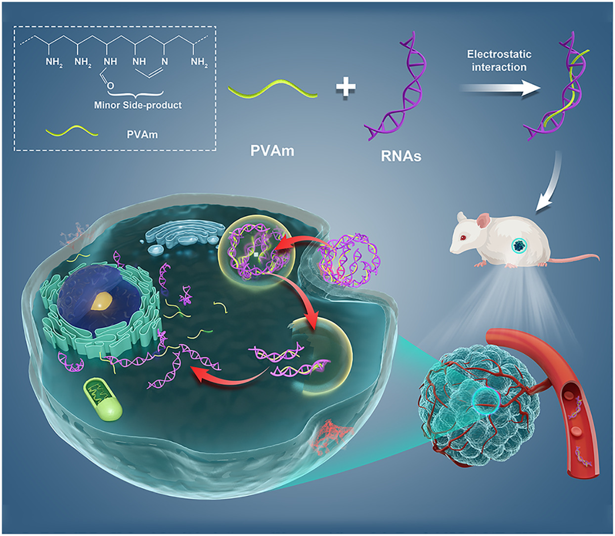 当前RNA药物研发的主要瓶颈在于递送载体较难同时满足对安全性和有效性的严格要求。经典的聚乙烯亚胺(PEI)载体因与核酸分子间较强的结合能力和胞内“质子海绵效应”的存在而具备较高的转染效率,但同时其细胞毒性也较强。而聚乙烯胺(PVAm)与RNA之间亲和力适中,兼具胞内的“质子海绵效应”,既可有效保护RNA在循环过程中不被降解,又能促进RNA的胞内高效释放。研究结果表明,PVAm可向正常细胞、肿瘤细胞、干细胞等递送不同大小的RNA(siRNA、miRNA和重组RNA等),具有优于目前商品化的Lipofectamine2000和INTERFERin PEI的转染效果,且细胞毒性较低。以PVAm为载体向异种移植人骨肉瘤小鼠体内递送miR-34a,对肿瘤生长有显著的抑制效果;向高脂饮食诱导高血脂小鼠体内递送si-ApoB,可显著降低小鼠的血脂水平;同时,PVAm递送体系对两种模型动物的肝肾功能均无明显影响,也无明显的免疫原效应。
