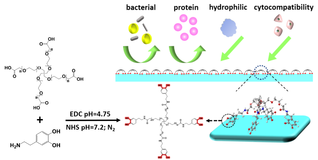 多巴胺是具备邻苯二酚结构的典型化合物,因此,本研究将多巴胺接枝在四臂PEG的末端,通过多巴胺的粘附作用将四臂PEG吸附于金属、硅、玻璃、高分子等多种材料的表面,形成增强型环状PEG亲水防污涂层。测试结果表明该涂层在多种材料表面粘附牢固,可显著提高材料表面的亲水性,并可有效抵抗蛋白质和细菌的吸附,同时兼具良好的细胞相容性。该多巴胺四臂PEG的合成可在水溶液中完成,其方法简单、过程环保,在各种材料表面的涂层均可通过简单的浸渍法制备,因而在多种材料特别是组织工程生物材料的亲水防污表面改性中具有极高的应用潜力。