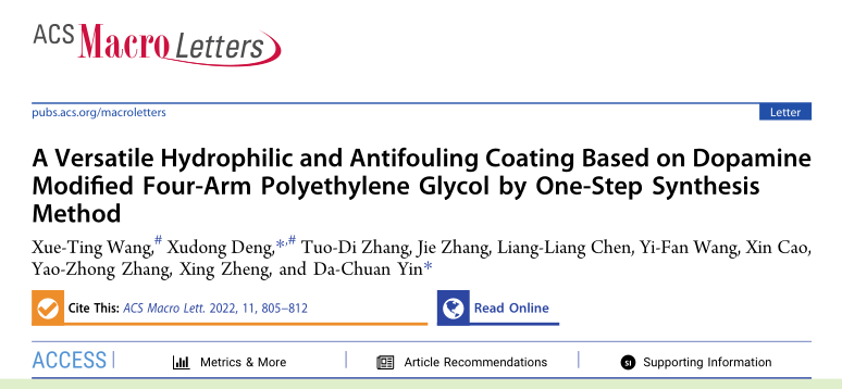 近日,英国365集团尹大川教授课题组在生物材料表面亲水防污涂层领域的研究取得新进展,相关研究成果以“Aversatile hydrophilic and antifouling coating based on dopamine modified four-arm polyethylene glycol by one-step synthesis method”为题发表于高分子学科顶级期刊ACS Macro Letters上。