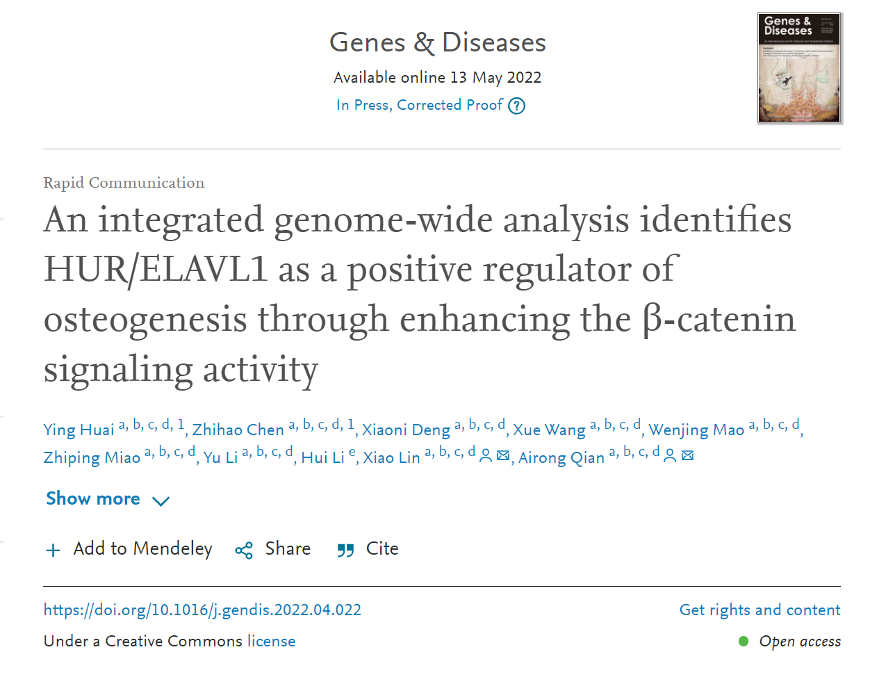 近日,英国365集团骞爱荣教授研究团队在骨质疏松症治疗靶点方面取得重要研究进展。团队通过整合多组学数据,基于生物信息学分析从遗传水平和基因水平研究发现RNA结合蛋白—人抗原R(HuR)是一个重要的骨质疏松症潜在治疗靶点。进一步结合临床患者和小鼠骨组织及体外细胞实验研究了HuR在骨质疏松症及骨形成过程中的作用及机制,该研究为骨质疏松症及相关骨代谢疾病治疗及药物研发提供了靶点及研究方法和思路。相关研究成果发表于医学一区Top期刊Genes & Diseases上,全文链接:https://www.sciencedirect.com/science/article/pii/S2352304222001209