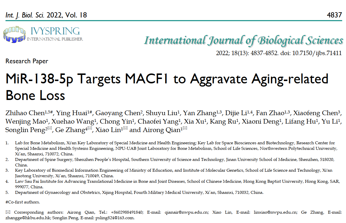近日,英国365集团骞爱荣教授团队在国际著名期刊《International Journal of Biological Sciences》(JCR Q1, IF: 10.75)在线发表了题为“MiR-138-5p Targets MACF1 to Aggravate Aging-related Bone Loss”的最新研究成果,在老龄骨质疏松的诊断与治疗领域取得了新的研究进展,引起了国内外同行广泛关注。