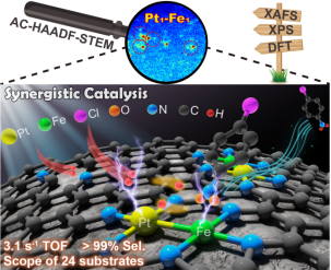 图1. Pt1-Fe1双单原子位点协同催化芳香硝基化合物选择加氢反应示意图
