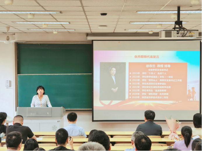 优秀教师代表徐春兰教授发言,她以从教15年的经验为例,号召全体教师做有理想信念、有道德情操、有扎实学识、有仁爱之心的“大先生”。