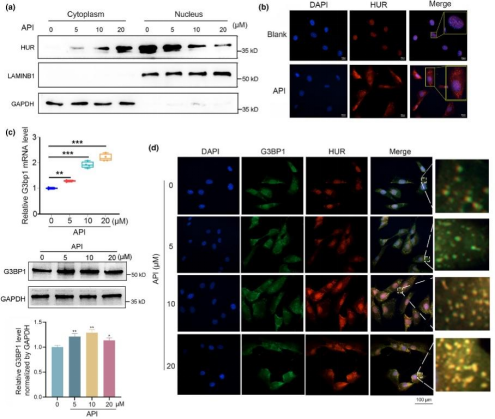 衰老损害成骨细胞功能和骨转换,导致年龄相关性骨退行性病变如老年性骨质疏松。应激颗粒(Stress granules, SGs)是一种无膜细胞器,可通过招募RNA结合蛋白(RBPs)来响应应激,是年龄相关性疾病的一种新的分子机制。在本研究中,我们发现HuR是一种骨相关的RBP,它在衰老过程中聚集成SGs并促进成骨。成骨细胞分化过程中,HuR阳性SG形成增加,HuR过表达挽救了衰老成骨细胞SG形成的减少。此外,HuR通过与β-catenin结合并招募其到SGs中,正向调节β-catenin的mRNA稳定性和表达。作为潜在的治疗靶点,HuR激活剂芹菜素(Apigenin, API)可增强HuR的表达和核输出,促进HuR阳性SGs的形成及其对β-catenin的募集,进而增加了β-catenin核转位,最终促进成骨细胞分化。我们的研究结果首次提出了HuR及其SGs在骨骼老化过程中促进骨生成的作用,并为治疗年龄相关骨骼疾病的新策略奠定了基础。