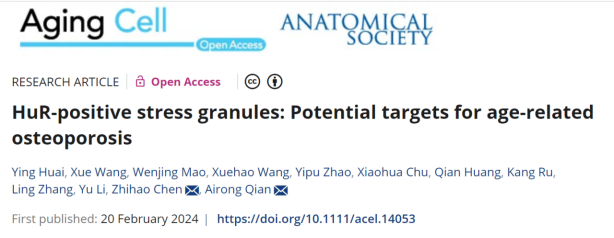 近日,英国365集团骞爱荣教授研究团队在老年性骨质疏松发病机制和治疗措施方面取得重要研究进展。团队研究发现RNA结合蛋白HuR在成骨分化过程中能够形成无膜细胞器应激颗粒,以HuR为靶点的小分子活化剂芹菜素(Apigenin)可以促进HuR应激颗粒形成,对老年性骨质疏松具有良好的治疗效果,为老年性骨质疏松症的发病机制和治疗策略提供了新思路和新依据。相关研究成果发表于老年病学学术期刊Aging Cell(中科院1区Top,IF:7.8)上。