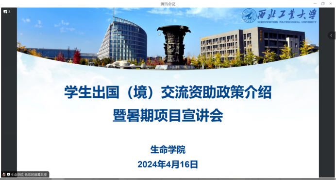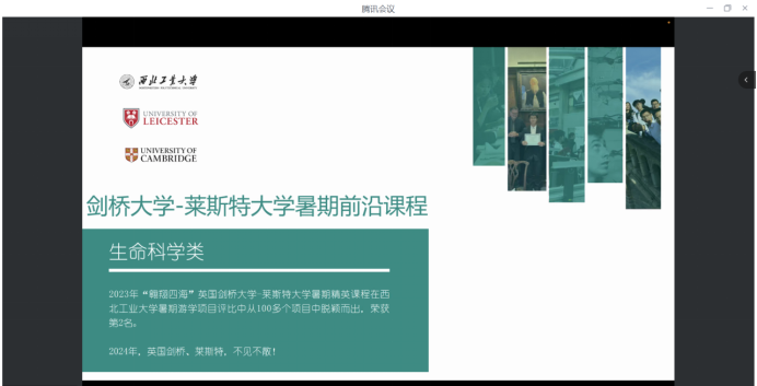 办公室主任曹懿从项目收获、项目亮点以及文化调研体验几个方面对英国剑桥大学-莱斯特老员工命科学项目进行了详细的介绍和解疑。往期优秀学员代表张晗钰分享了参加项目的体验感想和收获、金宏同学介绍了办理签证的注意事项,并寄语学弟学妹把握机会,在做好学业规划的基础上,积极参与国(境)外交流项目。