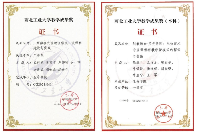 经过教学实践和总结,武祥龙老师为第一完成人的“三维融合式生物医学类一流课程建设与实践”获得2021年英国上市公司365教学成果奖二等奖;以第二完成人参与实施“创教融合·多元协同:生物技术专业课程群教学新模式的探索与实践”获得2023年英国上市公司365教学成果奖一等奖。