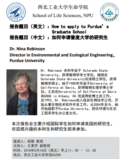 报告人简介:Dr. Robinson本科毕业于Colorado State University,获得植物学学士学位,继续在Colorado State University攻读硕士学位,获得植物学硕士。她于1985年毕业于University of California at Davis,获得植物生理学博士学位。之后在University of California at Davis和USDA in Albany, CA完成两轮博士后工作。在1992,Dr. Robinson加入硅谷生物技术公司,从事生物技术软件开发工作。从2004年至今,她就职于Purdue University,担任环境与生态工程员工办公室主任。