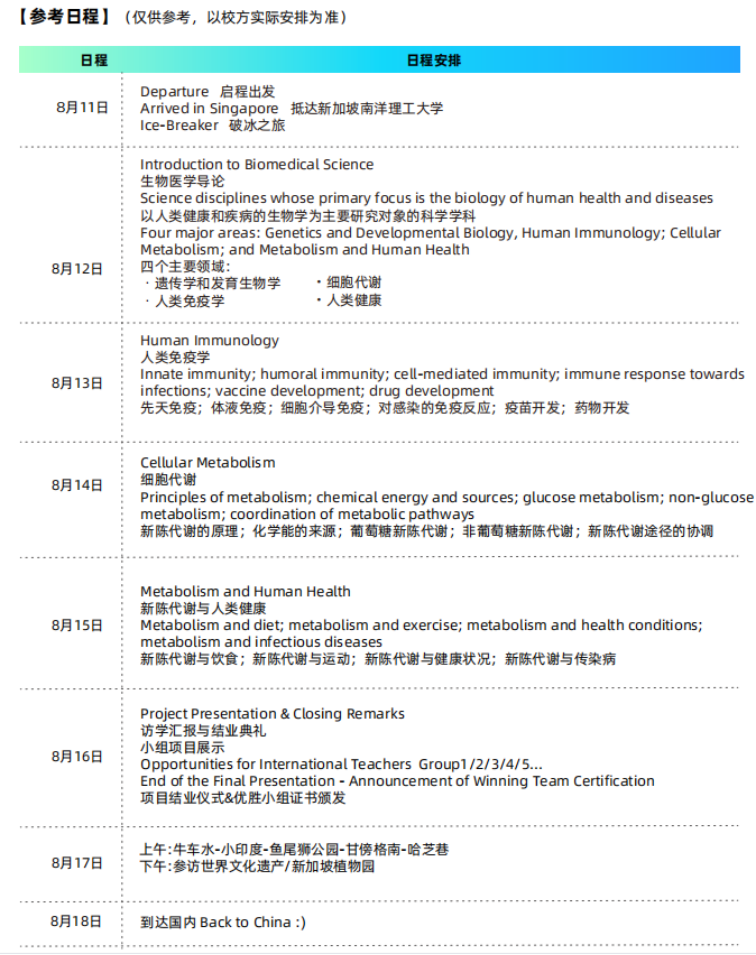 课程将开设生物医学与疾病健康、药物开发与人体免疫、细胞代谢与疾病预防与新陈代谢与人类健康等相关主题,涵盖新加坡南洋理工大学特色专业课、小组讨论、结业项目展示等内容,最大程度的让学员在短时间体验南洋理工大学的学术特色,以提升学员专业知识储备,拓展国际视野。共30课时,包含20课时的授课时间及10课时的人文参访、企业调研、实验操作等。